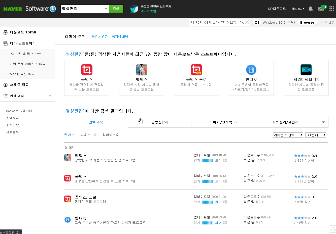 네이버 소프트웨어 자료실 기준으로 라이선스가 무료는 맵 믹스(Vapmix), 곰 믹스(GOM Mix), 반디 컷(Bandicut) 정도 유료는 어도 비프 리미 어프로(Adobe Premiere Pro CC), 베가스 프로(Vegas Pro)가 눈에 들어왔고... 파워 디렉터(PowerDirector)라는 건 유료 같은데 네이버 소프트웨어에서 보니 시디 키를 제공??? 뭐가 이상한 느낌 ㅎㅎ