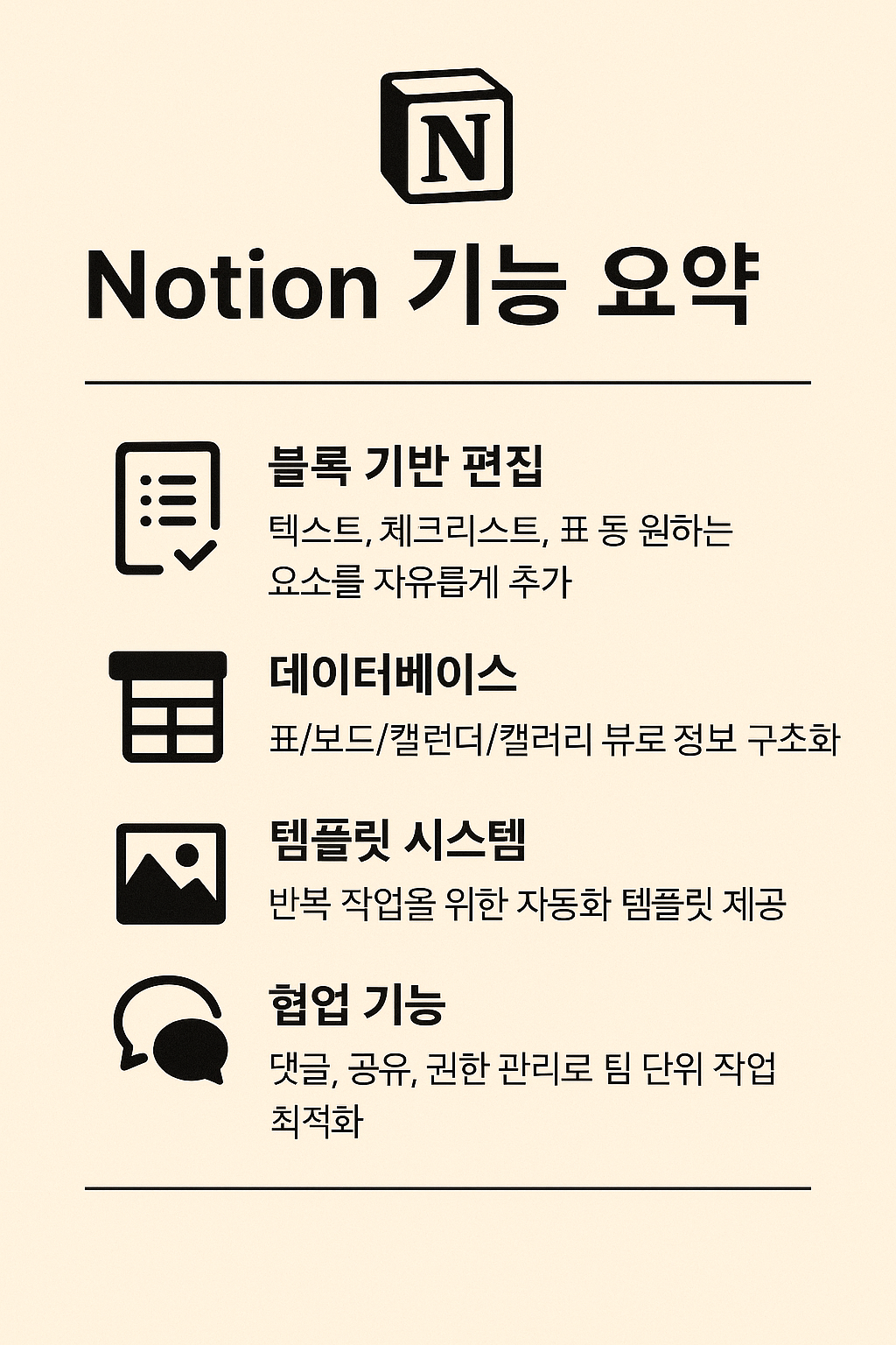Notion은 단순한 메모 앱을 넘어 일과 생활을 구조화하는 도구입니다. 블록 기반 인터페이스와 강력한 템플릿 시스템, 협업 기능까지 갖춘 만큼, 2025년에도 생산성을 높이고 싶은 누구에게나 강력히 추천할 수 있는 툴입니다.